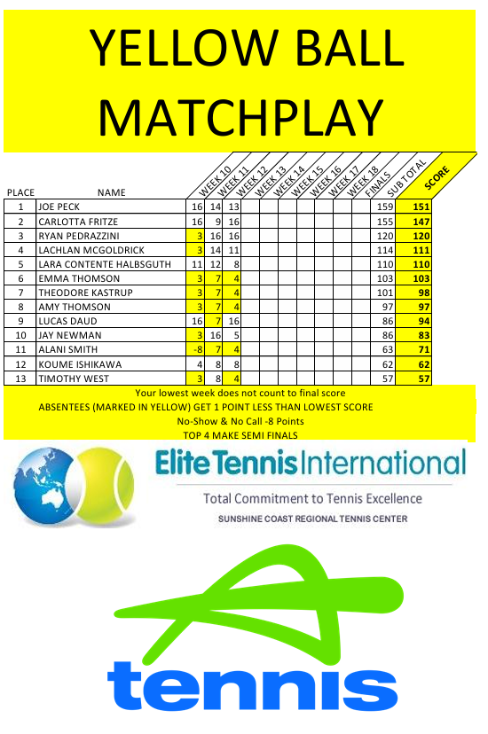 Yellow Ball Matchplay Yellow Matchplay runs Friday evenings from 4pm to 6pm and is a great opportunity for our Yellow Ball players to gain match-play in a fun and friendly environment with ranking table kept with season ending finals. Click Here for Yellow Matchplay Rules