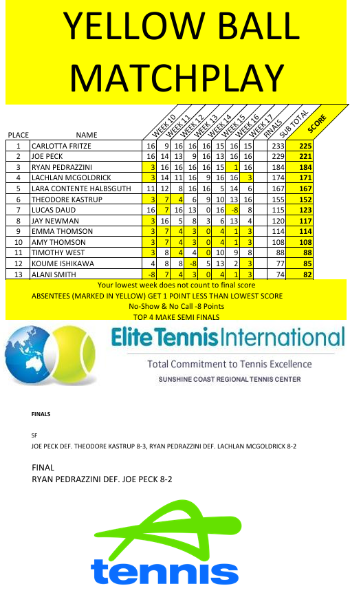 Yellow Matchplay runs Friday evenings from 4pm to 6pm and is a great opportunity for our Yellow Ball players to gain match-play in a fun and friendly environment with ranking table kept with season ending finals.